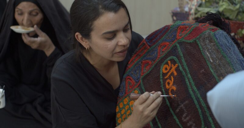 AF—Elsewhere is a long-term social engagement project that traces Arab and South Asian migration to Latin America and the Caribbean. The result of the work, which brings specific geographies and inheritances into an artistic context, is an ever-expanding series of tapestries. I make these with a cooperative of 80 weavers in Nasiriyah in southern Iraq, through a process that involves workshopping, storytelling, drawing, dyeing yarn, and embroidery. The tapestries depict places and ephemera that are the result of Arab and South Asian migrations to Latin America at the turn of the 20th century—political communities, the southern Mahjar, third world solidarity networks, but also everyday people.