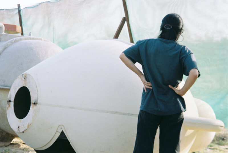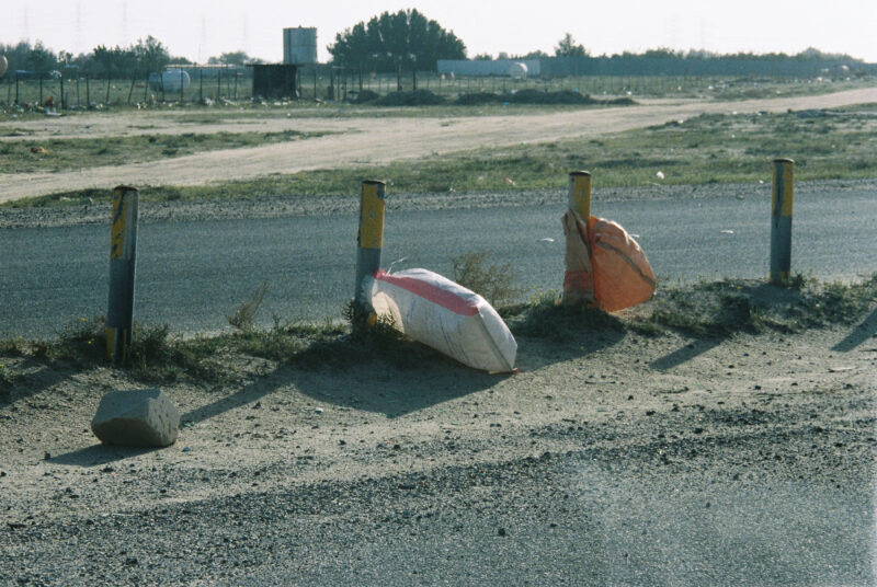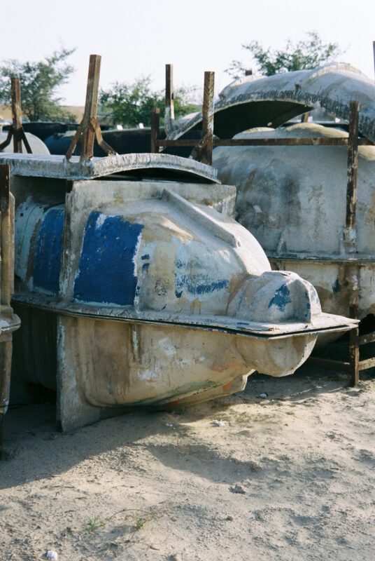 I spend a lot of time driving when I am in Kuwait. It feels like the back end of the world. I like to go into the desert and see things, look at camels, and collect industrial leftovers from around the oil refineries and adjacent facilities. Lots of sun-baked plastic, lifting slings, barrels, ossified bones, shredded tires, broken furniture. I try not to have a preconceived idea of what I am looking for or what I want to make, but rather let myself be guided by the things I come across.